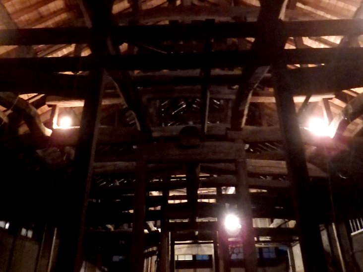 修理したのは、屋根瓦(魅力ある古瓦の屋根が変わってしまったのは残念ですが、痛みもひどかったため仕方ありません)と全体の壁、傷んで使えなくなった建具などです。キトラス部分には床を貼り厨房やトイレも設置し交流できるような場所を作り、小屋組に照明を設置し、夜でもこの建物の持つ雰囲気が味わえるようにしています。