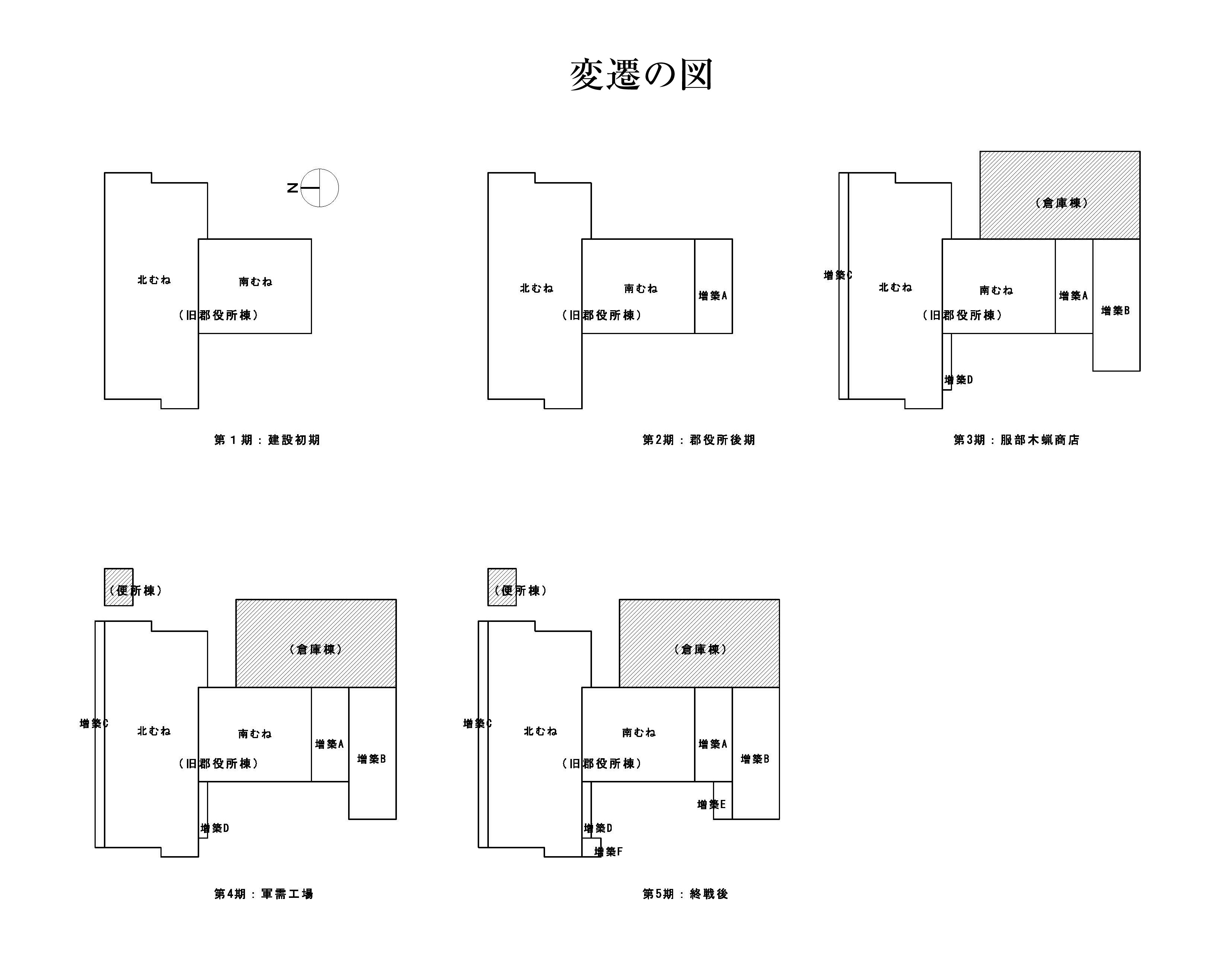 郡役所が大正2年に別の場所に新築移転した後、服部木蝋工場、戦時中の銃弾製造工場、戦後の集合住宅、服部飼料店へと形態を変えながら、増改築を加えられ現在のような形になっています。(→変遷の図を表示)